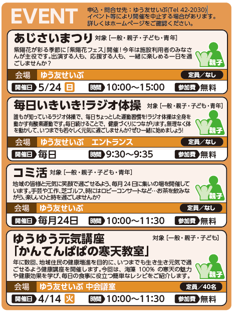 会場ゆう友せいぶ イベント等により開催を中止する場合があります。 詳しくはホームページをご確認ください。 申込・問合せ先:ゆう友せいぶ(Tel 42-2030) 所在地/〒485-0077西之島528番地1 ホームページはコチラ