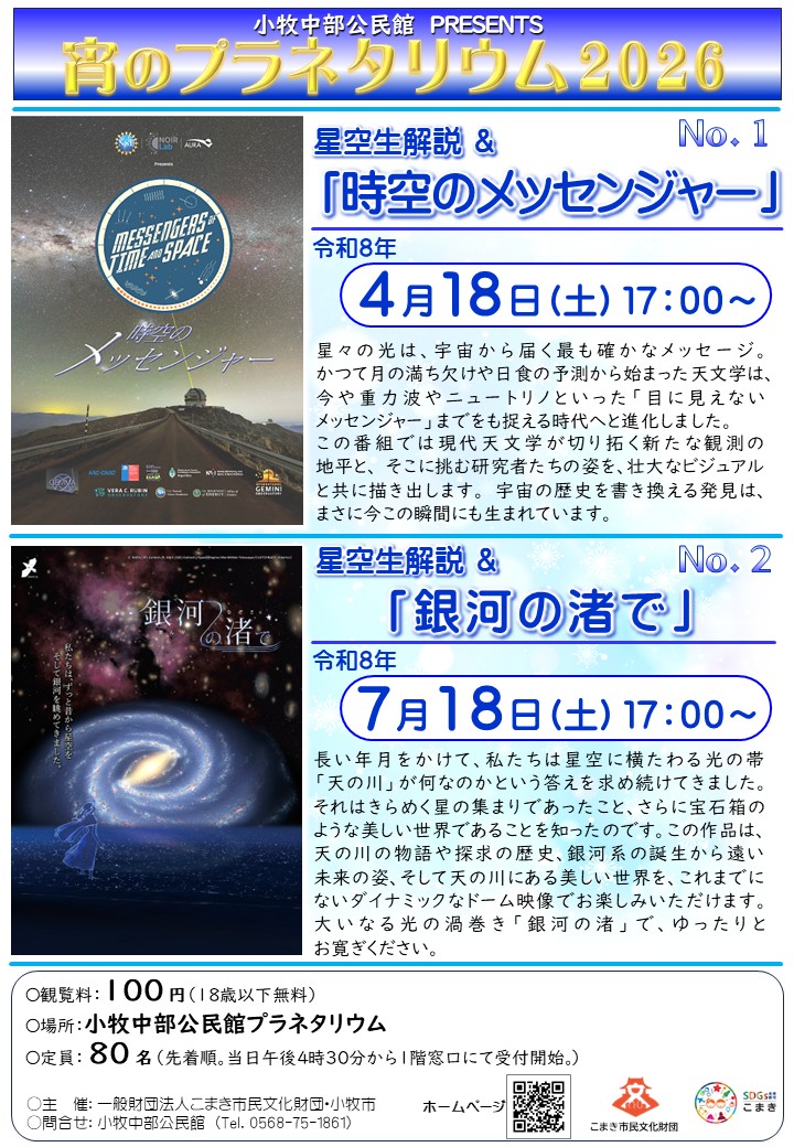 | 定 員 | 80名(先着順。当日16:30から1階窓口にて受付開始。) ※投映開始後は入場できません。 |