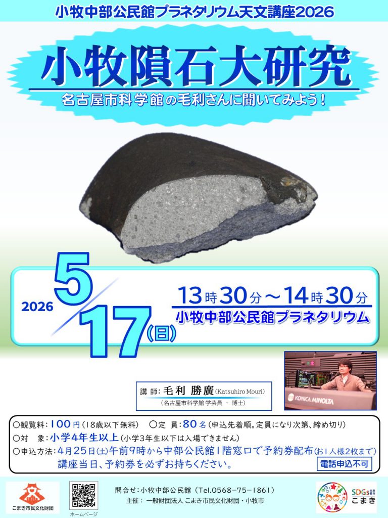 2026/04/01 イベント 2026天文講座 ~小牧隕石大研究~名古屋市科学館の毛利さんに聞いてみよう!開催日:5/17(日) 13時30分~ (約60分) 〇対象:小学4年生以上 (小学3年生以下は入場できません) 〇講師:毛利 勝廣 (名古屋市科学館 学芸員・博士) 〇申込方法:4月25日(土)午前9時から中部公民館1階窓口で予約券配布。 (お一人様2枚まで) ※電話申込不可