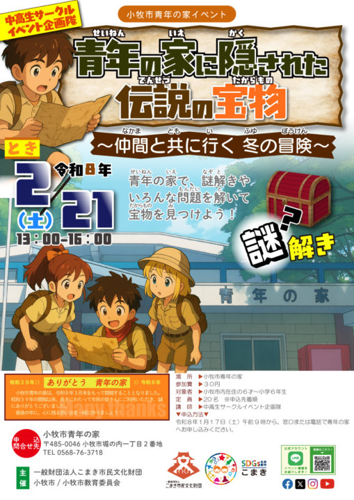 ・日時:令和8年2月21日(土) 13:00~16:00 ・場所:小牧市青年の家 ・参加費:30円(保険代) ・対象者:小牧市在住の6歳~小学校6年生 ・定員:20名 *申込先着順 ・講師:中高生サークルイベント企画隊 ・申込方法 令和8年1月17日(土)午前9時から窓口または電話で青年の家へ 電話:0568-76-37818